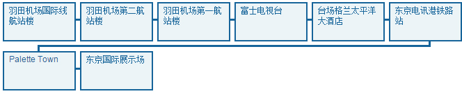 国际线候机楼→第2候机楼→第1候机楼→富士电视台前→台场格兰太平洋大酒店→东京电讯站→台场五彩城前→东京国际会展中心
